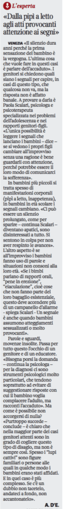 “Se i bimbi parlano di rapporti orali, ‘pene in erezione’, ‘eiaculazione’, cioè cose che non fanno parte del loro bagaglio esistenziale, questo deve accendere più di un campanello d’allarme – spiega ScaIari – Un segnale è anche quando bambini assumono atteggiamenti sessualizzati o molto provocanti”.